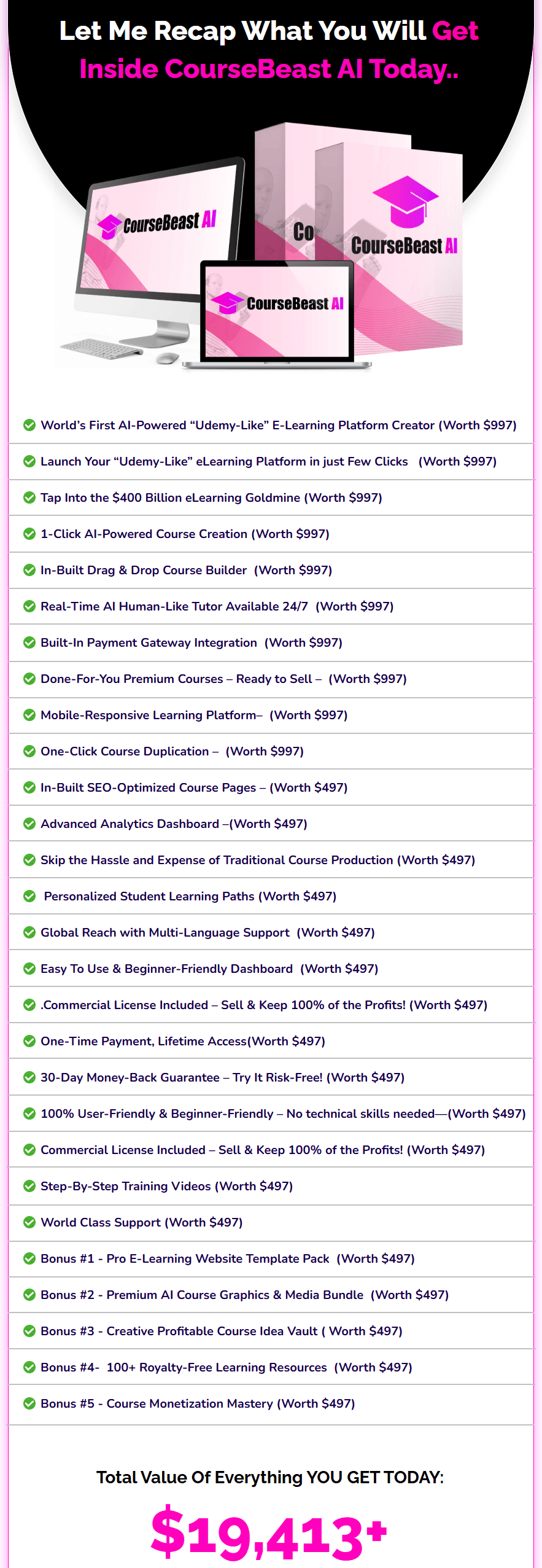 With CourseBeast AI You Can Create and Sell Courses in Any Topic, in Any Possible Niche with a Stunning Udemy Like Website, Marketplace and Members Area. Say Good Bye to The Struggling Days. No more investing time & money to create courses and website etc. No more hiring freelance developers, designers, or content creators for high recurring fees. No need to pay monthly recurring to expensive tools for creating courses and maintaining your website. No more struggle to convert your skills into profitable course selling business to generate passive income. So, it’s time for you to Start Living a Laptop Lifestyle that gives you the ability to spend time in your own way by saying Goodbye to all your worries. Get It Now.